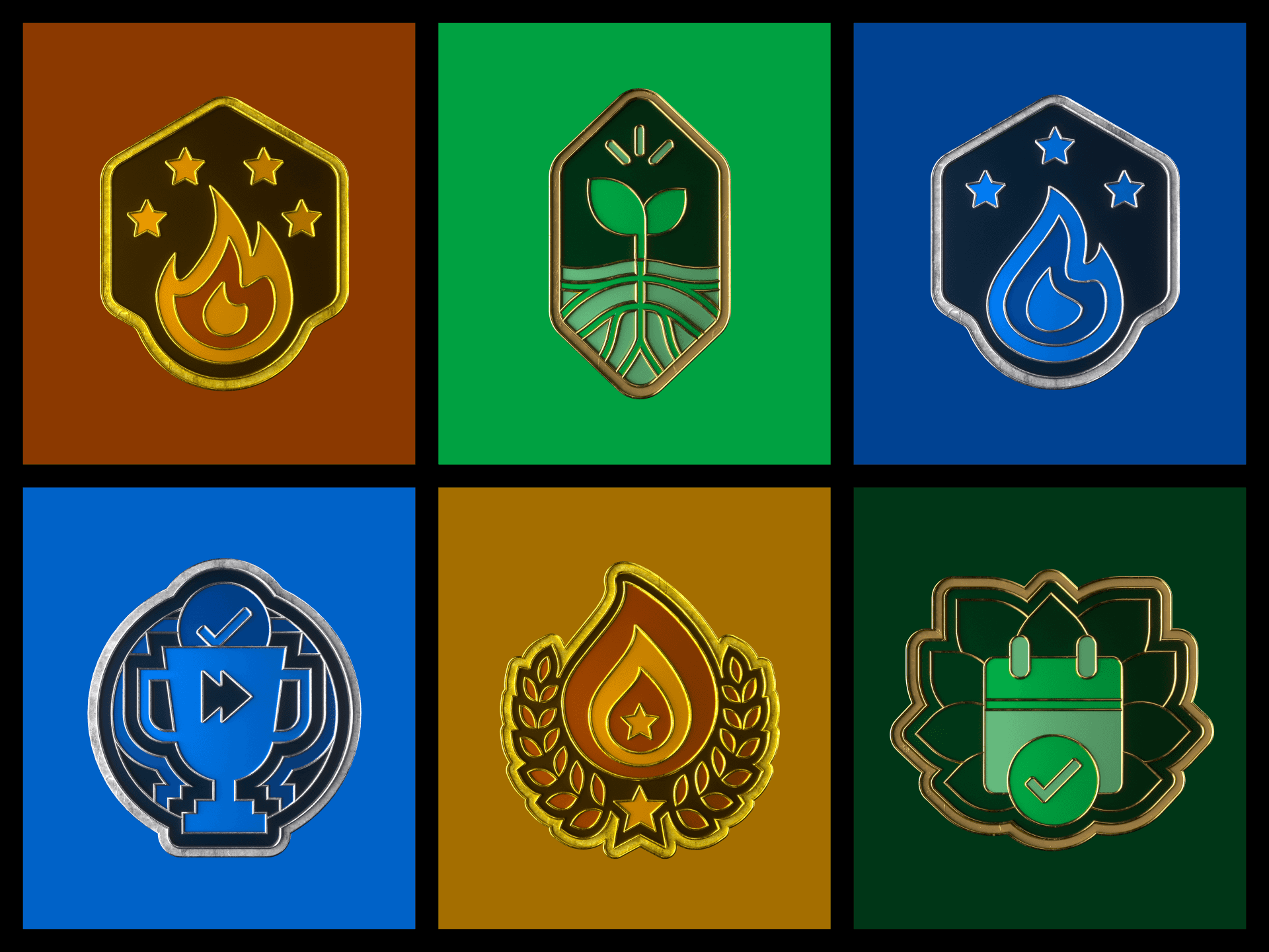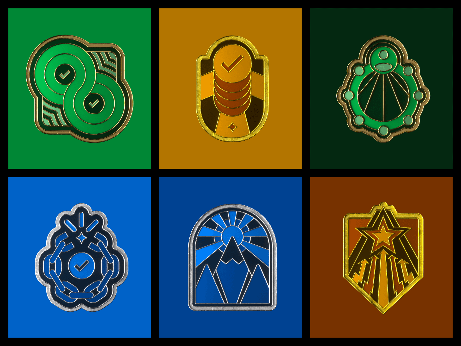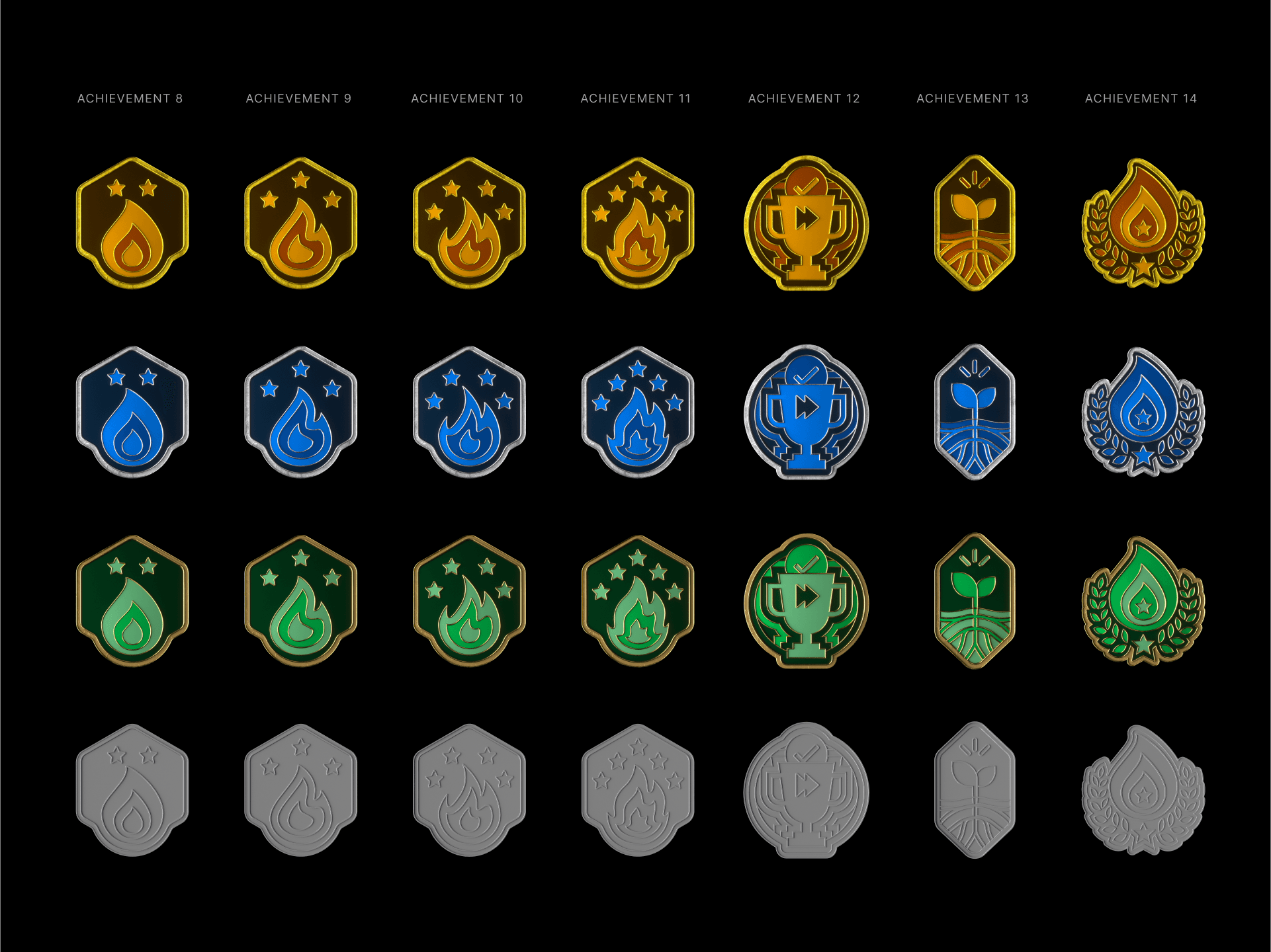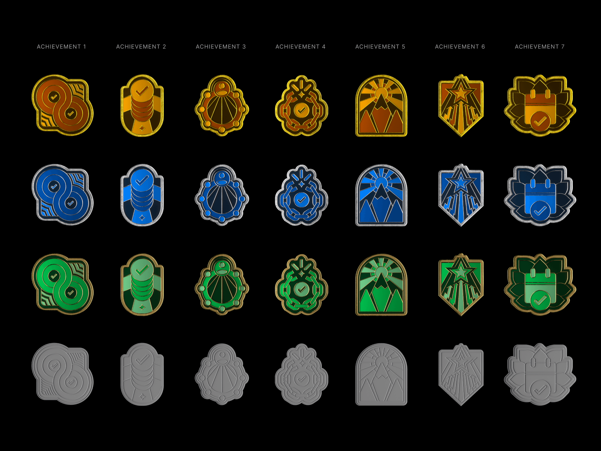 Each badge has four tiers: gold, silver, bronze, and the empty slot.