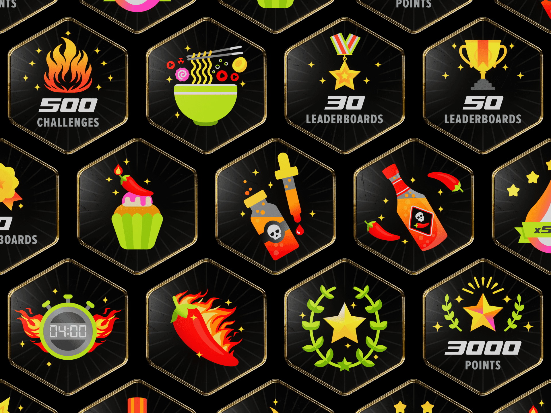 Firehub is a competitive community of chilli-eating champions. These badges were designed to award various achievements for members from specific challenges to hitting milestones of accrued points.