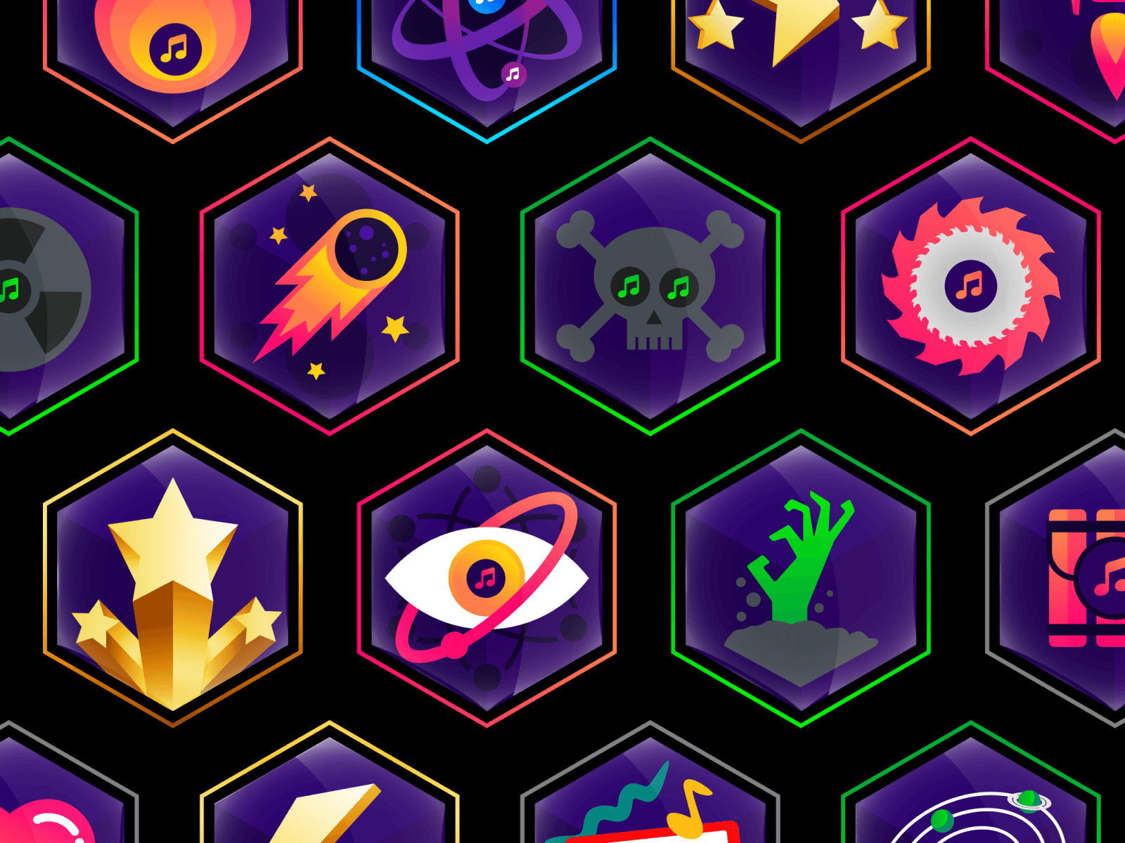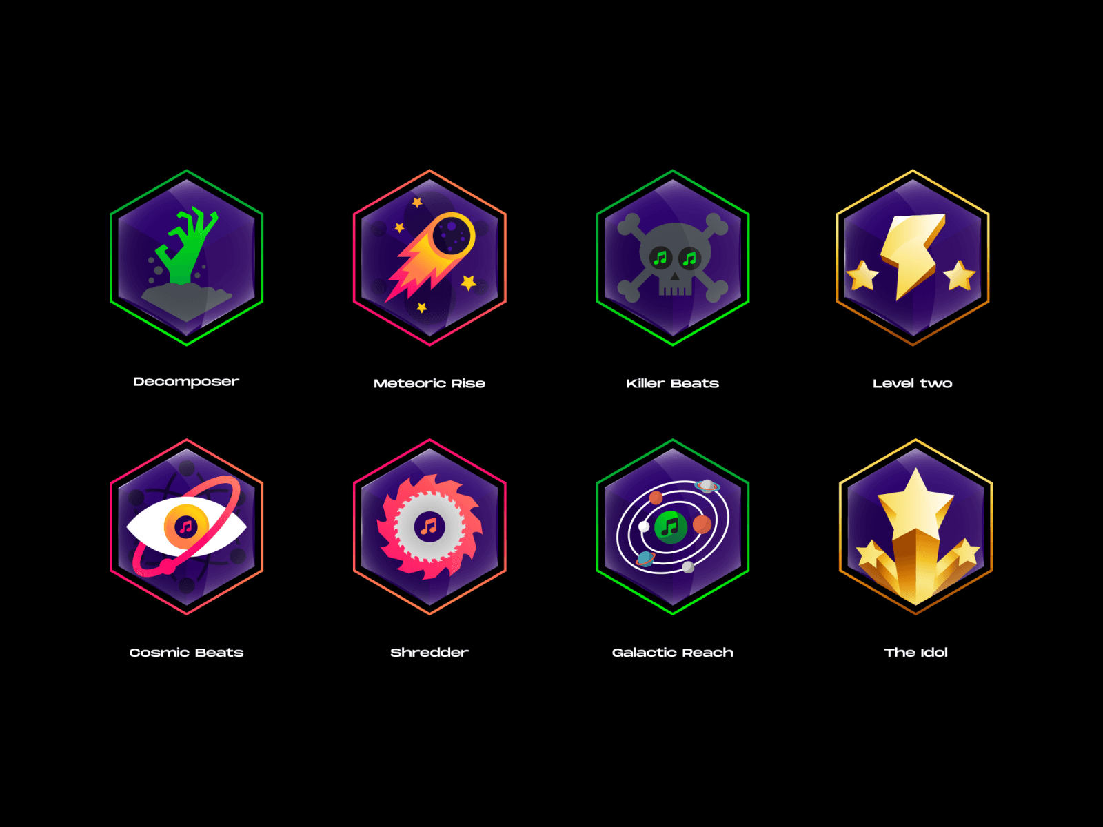 Music composition achievement badges I've been working on for a side project. The concept is a collaborative music composition platform with gamified elements. There's a lot of work to be done to fine-tune the tool's concept but wanted to share these for now as I'm digging them.